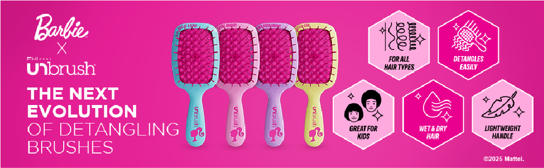 The visuals used bold, pastel tones and a glossy palette inspired by Barbie’s aesthetic, paired with clean product photography and minimalist backgrounds to let the brushes stand out. Copy and layout emphasized both beauty and utility — highlighting features like “gentle detangling,” “works wet or dry,” and “on-the-go styling” — while playful accents (pop color blocks, cursive script, subtle silhouette motifs) reinforced the brand’s fun and fashionable identity. The result felt fresh and on-brand for Barbie fans, while showcasing UNbrush’s premium hair-care benefits.