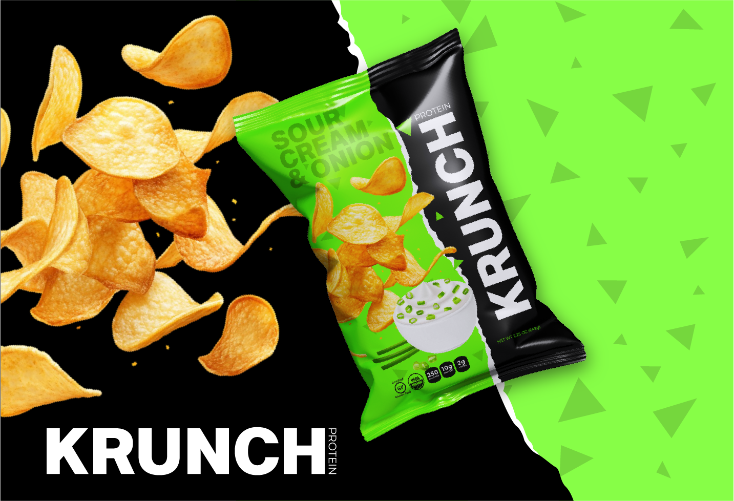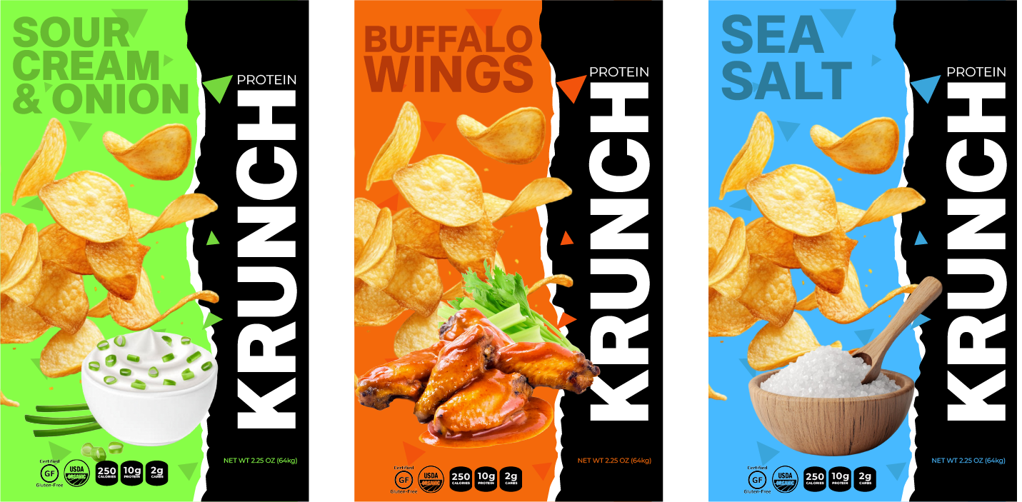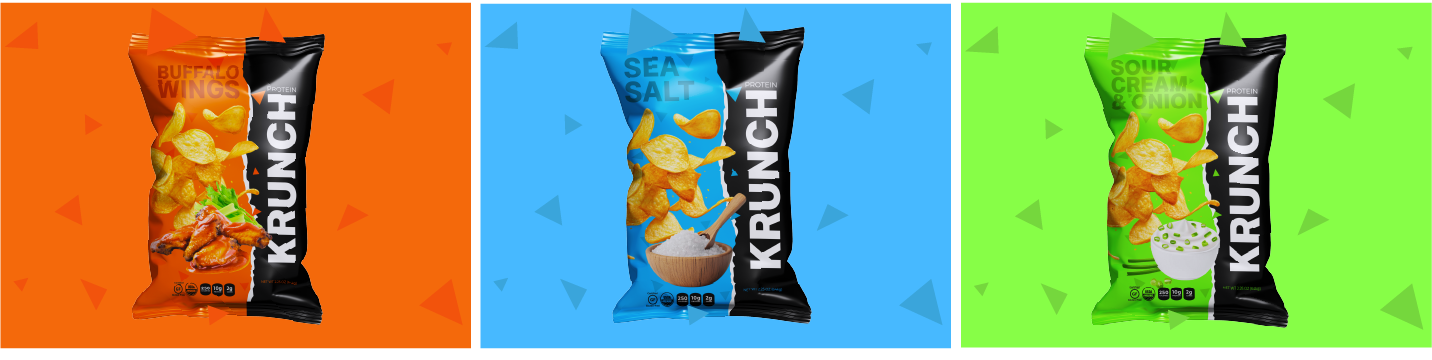 For Krunch, a new protein-chip brand, I created a full visual identity that communicates bold flavor and better-for-you snacking. The goal was to position Krunch as energetic, modern, and health-focused while standing out in a crowded snack aisle.